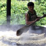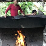 Na parte da tarde, acompanhamos uma família na produção da farinha de mandioca. Pai, mãe, avó e filhos se dividiam nas tarefas de ralar a mandioca, esculpir a pá que foi usada para torrar a farinha e preparar o tacho onde ela seria feita. Mais uma troca de aprendizado que os mais velhos passam para os mais novos para manter viva a cultura indígena. Depois voltamos a igarapé para novas gravações com as crianças e suas brincadeiras na água, as cantigas e a interação delas com a floresta.