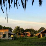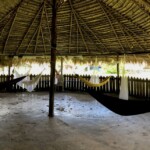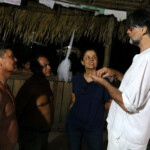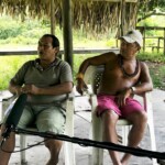 Neste primeiro dia na aldeia, montamos nossas redes, ajeitamos nossos equipamentos, os mantimentos, enfim, nos alojamos, e fomos conversar com os anfitriões. O cacique Juarez nos apresentou a aldeia, nos deixando muito à vontade e nos acolhendo muitíssimo bem. Aos poucos, nossa expedição foi tomando forma. Nós ficamos abrigados na escola da aldeia. Na sala de aula, que fica em uma casa, deixamos os equipamentos de filmagem e nossas malas. Porém dormimos em outra sala de aula, em uma espécie de tenda com telhado de palha e cerca de madeira. Montamos nossas redes com mosquiteiro – item indispensável quando se trata de Amazônia. Aaah, e sem esquecer dos nossos inseparáveis companheiros de viagem: aranhas, sapos, pererecas e muitos, muitos pernilongos.