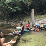Nesta primeira tarde de aldeia, também fomos apresentados a um lugar que frequentamos bastante enquanto estivemos no território Munduruku: o igarapé. Trata-se de uma nascente que vem do meio da floresta e forma um pequeno poço de água transparente, onde os indígenas lavam suas roupas, louças e tomam banho. A água corrente deixa o igarapé sempre limpo e propício para um mergulho e uma refrescada do calor amazônico. E um detalhe: a margem do igarapé é formada por argila branca. Ou seja, além de ser um momento de descontração, o igarapé servia para fazermos uma esfoliação na pele!