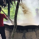 Depois de gravarmos esta troca de sabedorias, fomos acompanhar outro momento muito tradicional para o povo Munduruku: a colheita de batata doce para fazer o kaxiri, uma bebida típica de dias de festas e comemorações da etnia, que consiste em uma mistura da batata – cozida e espremida – açúcar e farinha de mandioca.